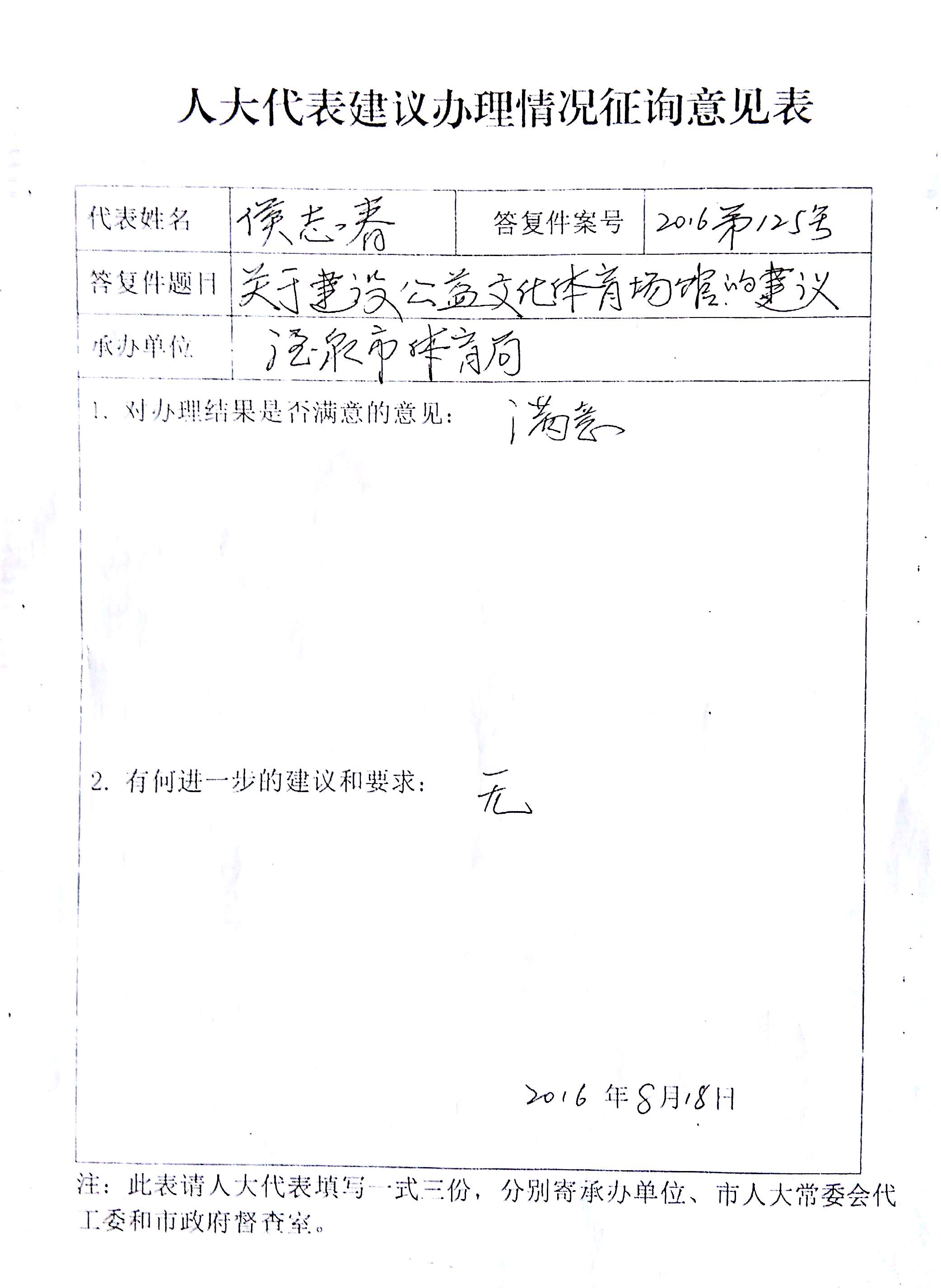 我局将进一步加强与规划和建设部门的沟通、配合,结合城市系统建设因地制宜增设公益体育场馆设施。同时,也将体育设施建设作为《酒泉市全民健身实施计划(2016-2020)》中的重要组成部分,科学规划,合理布局,让越来越多的市民享受到健身休闲的快乐生活。