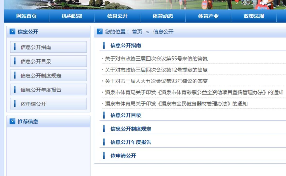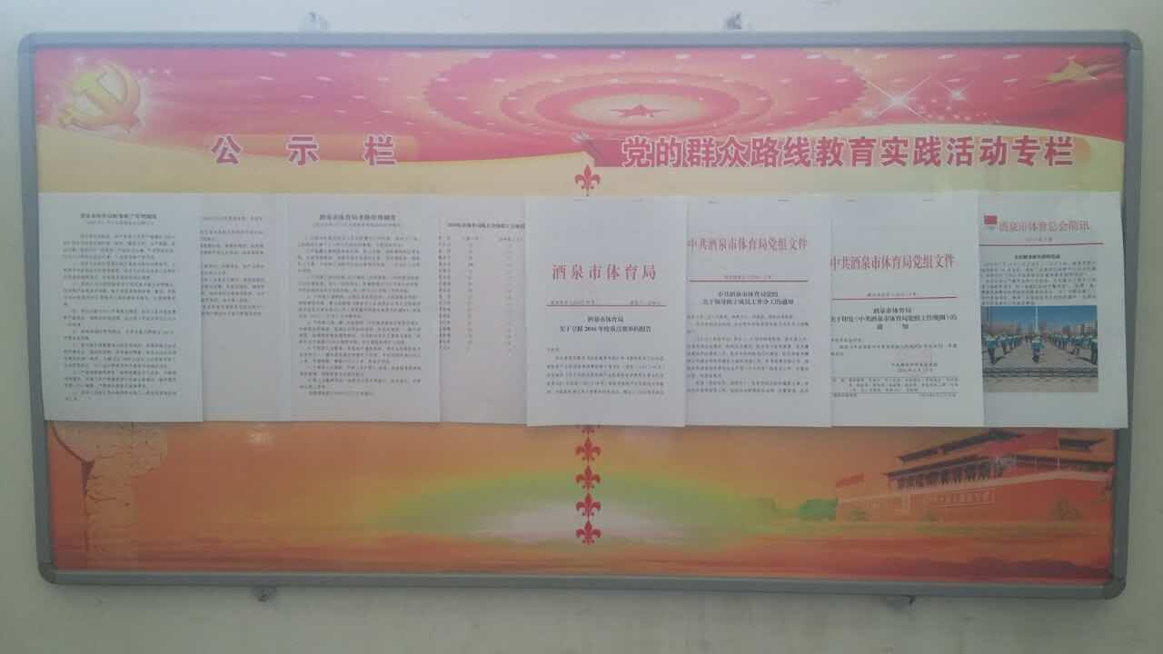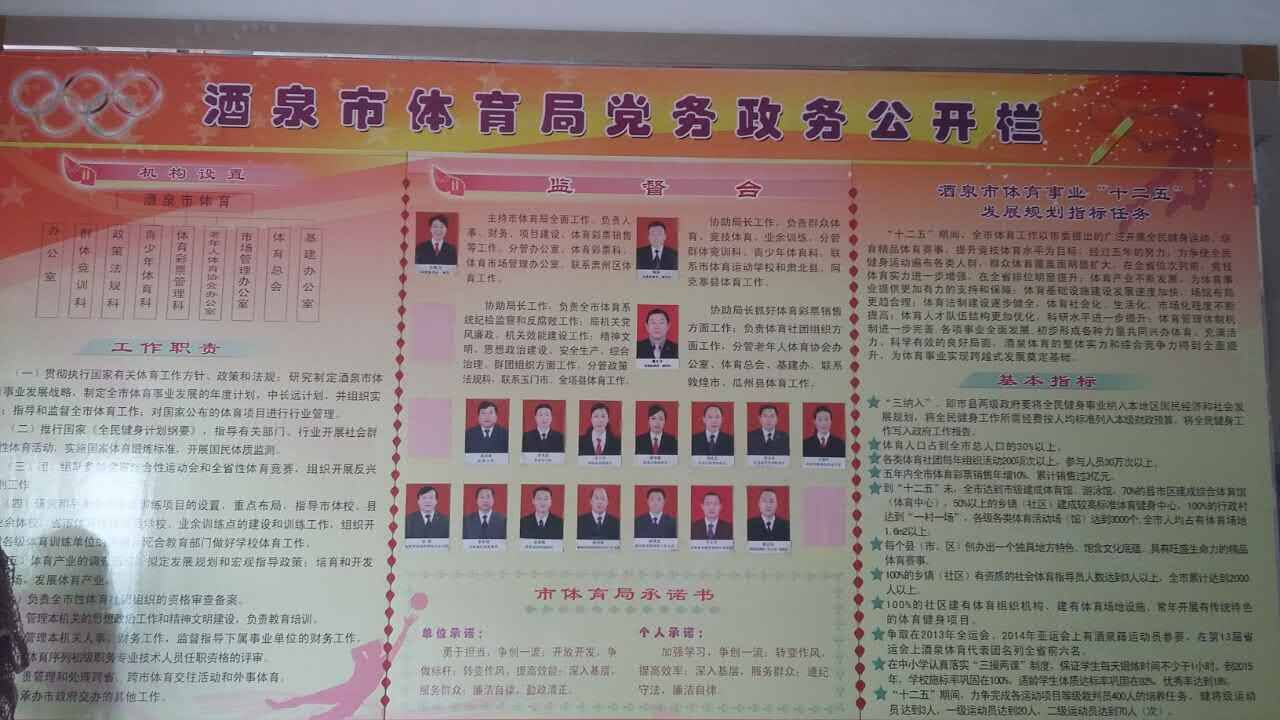 网站“酒泉市体育信息网”、微信公众平台,实施网上政府信息公开;五是通过电视、报刊等新闻媒体扩大宣传;六是以全民健身活动为平台,在各类体育比赛、群众活动场所进行政府体育政策宣传、信息发布。