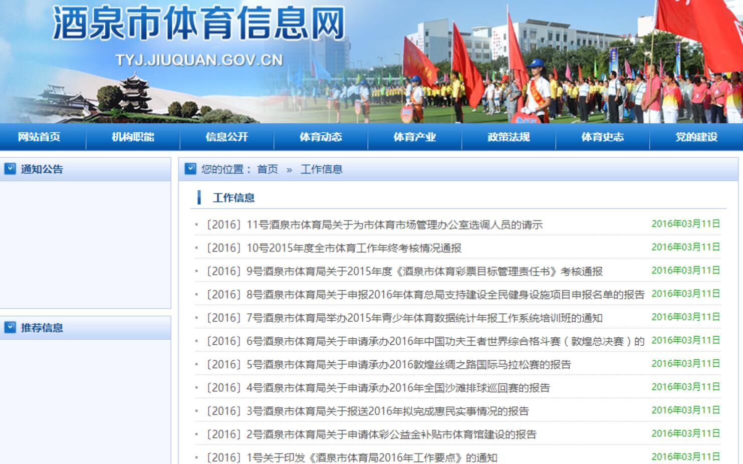 体育彩票等方面,均在“酒泉市体育信息网”上公开和向市委、市政府办公室信息科传递,并积极向“酒泉电视台”“酒泉日报”“甘肃省体育局信息网”、“中国体育报”、“酒泉市体育局微信公众平台”等新闻媒体投送。